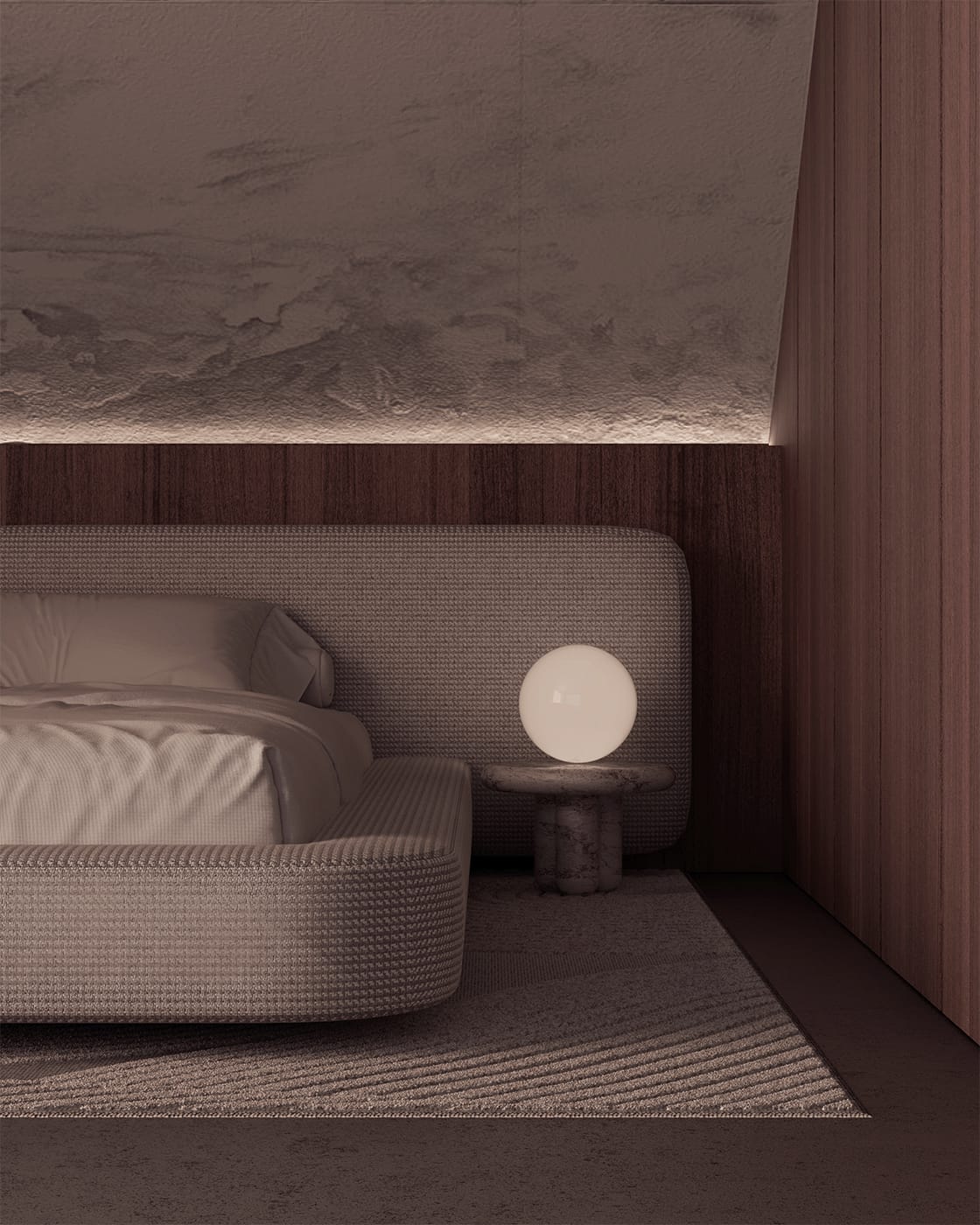 Sypialnia i łazienka kontynuują narrację “bezpiecznego schronienia”. Sypialnia, umieszczona pod skosami, otula miękkością. Niskie łóżko z tapicerowaną ramą, nastrojowe oświetlenie ledowe ukryte za wezgłowiem oraz kamienny stolik nocny tworzą intymną atmosferę.