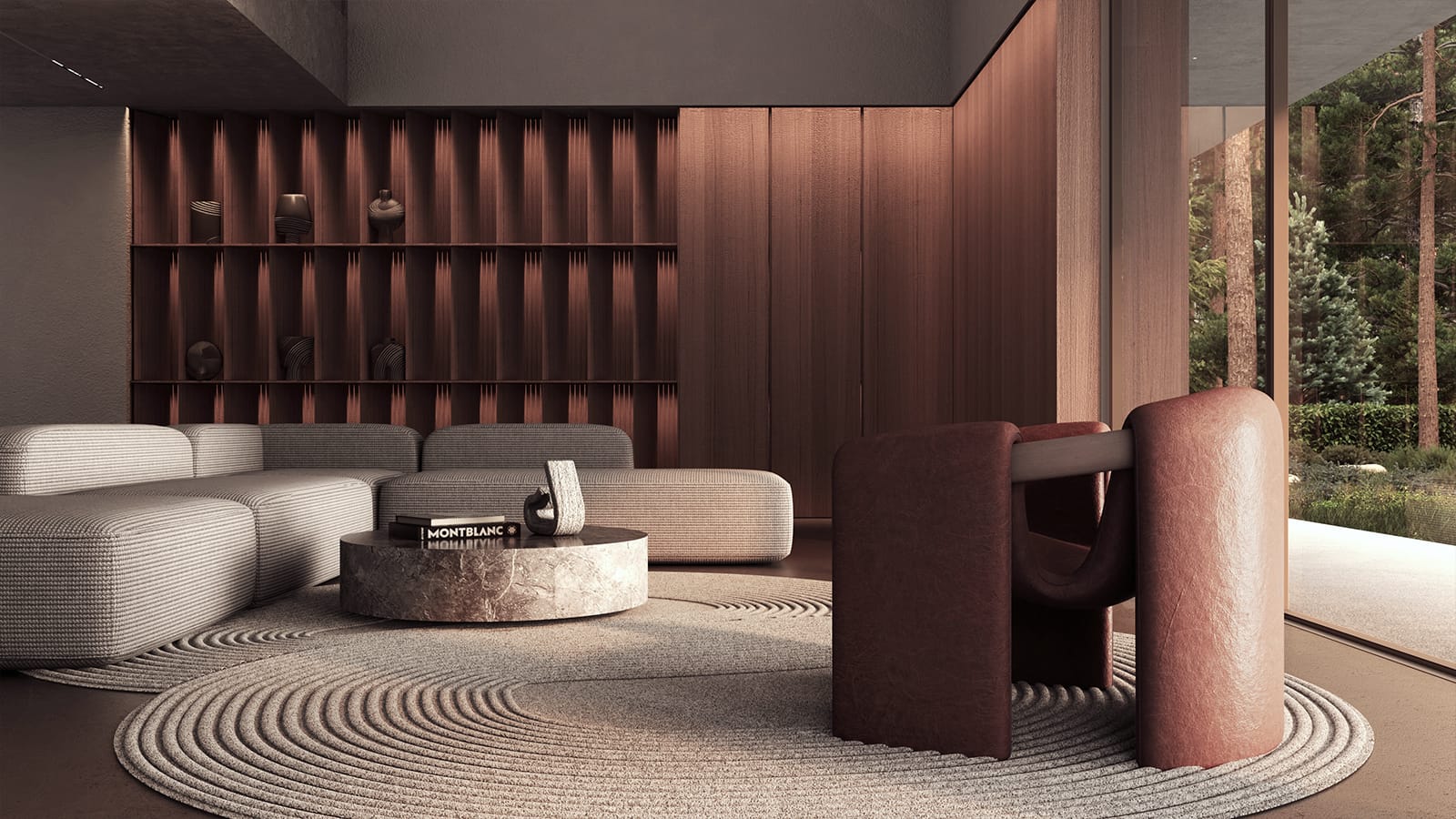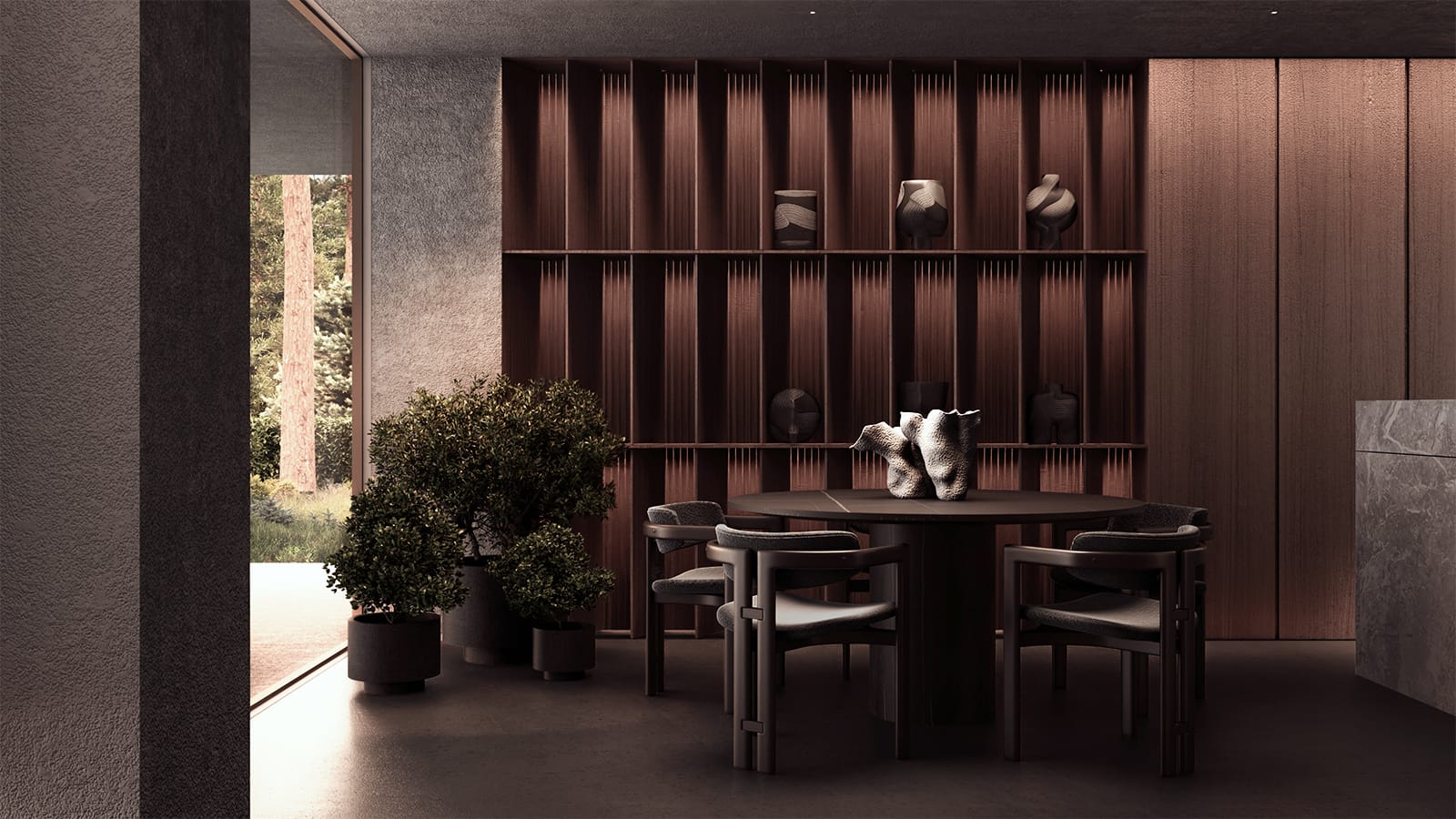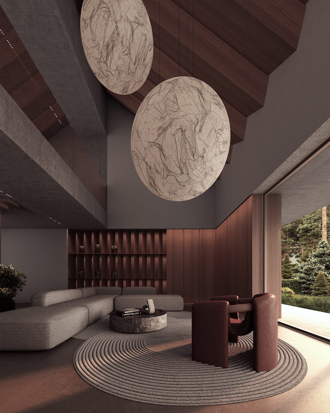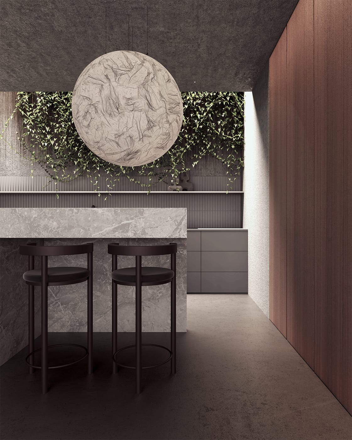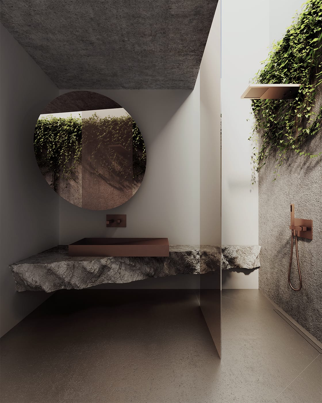 Prawdziwą perełką jest jednak łazienka. To domowe spa, w którym umywalka nie jest po prostu ceramiką, lecz rzeźbą. Prostopadłościenna misa w kolorze miedzi spoczywa na surowym bloku skalnym o nieregularnych, ociosanych krawędziach, który wygląda, jakby został wyrwany prosto ze zbocza góry. Nad nim, ponownie – świetlik z kaskadą zieleni, pozwalający brać prysznic w strugach naturalnego światła, z poczuciem przebywania w dzikiej naturze.